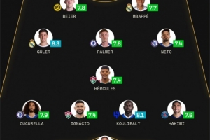 中场:居勒尔(皇马,8.3分)、帕尔默(切尔西,7.8分)、赫克勒斯(弗鲁米嫩塞,7.4分)、内托(切尔西,7.4分)